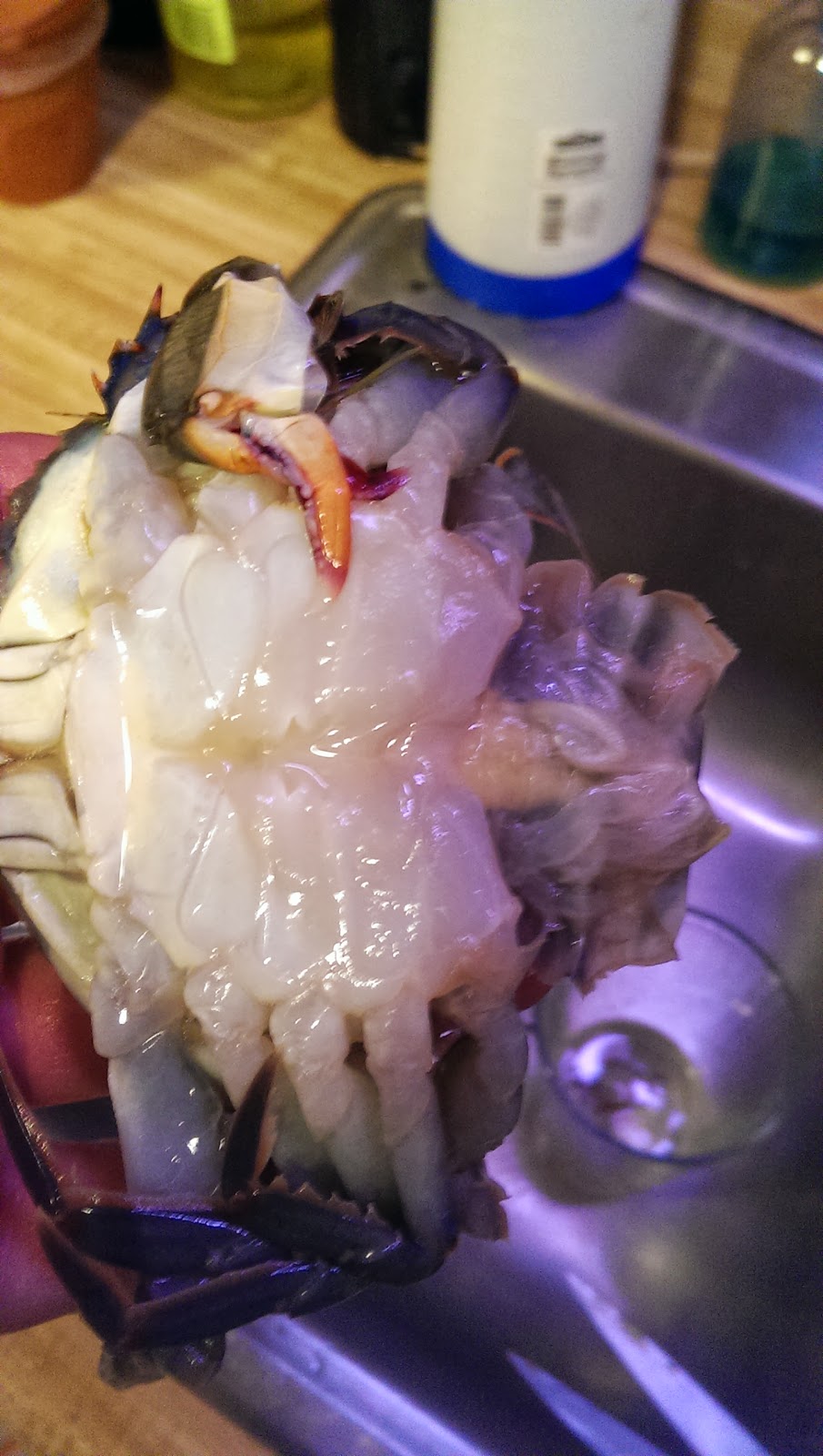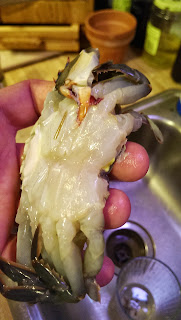 - Start by washing crab, if they are alive the first thing you do is cut the face off if frozen save this till after you remove gills and flap.